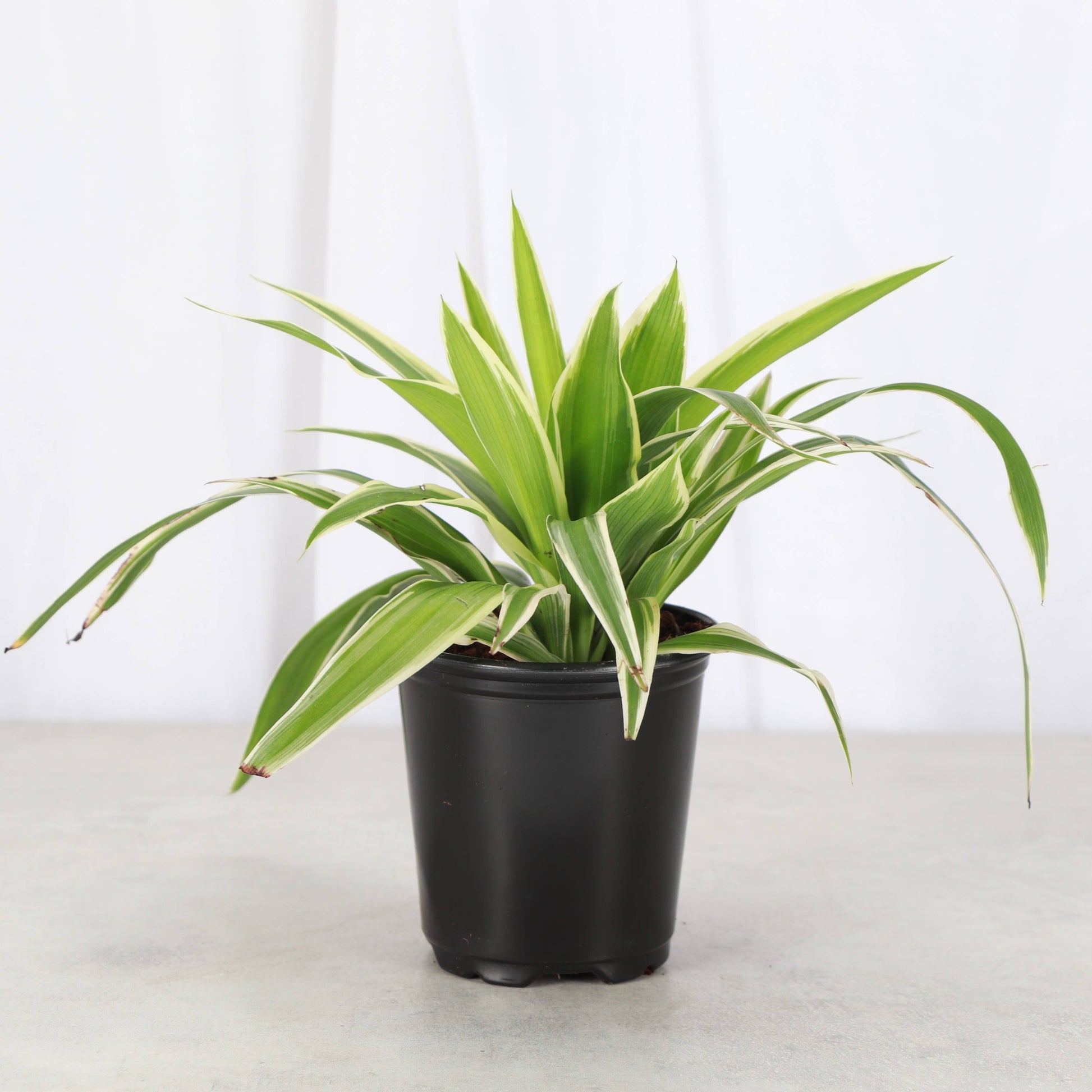 Irish Spider plant displays multicolored, playful leaves in shades of green and white. Each leaf displays an outer edge of white or cream, with the inner leaf displaying both dark and light green shades. This plant is non-toxic and safe for pets. As they mature, they can grow baby plants - perfect for propagating!
